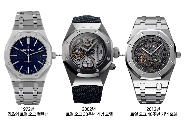• 1972 – 제랄드 젠타 디자인의 로열 오크 출시(옥타곤 베젤·노출 나사·통합 브레이슬릿).